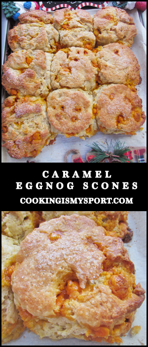 Eggnog has both the fat and the flavor to give your normal scone dough a holiday twist and boost of both. In this recipe, it’s joined by a healthy portion of caramel baking ‘chips’ that you should be able to find in the baking aisle of your grocery store right by where the chocolate chips are.