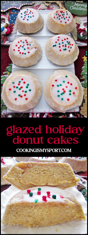 Whether it’s yeast or cake, my favorite way to enjoy a donut is when it’s covered in a thin and simple glaze. I saw no reason why I shouldn’t do the same for these, and baking them into mini dome-shaped cakes made this easy to achieve. While the cakes were baking, I prepared the glaze and after allowing them to sit in the pie tins for about 3 minutes, I turned them upside down and spread/poured the glaze over the tops, allowing/helping it to fall over the sides so that it covered the donut cakes completely. After adding a last bit of holiday cheer in the form of some sprinkles, I then allowed them to sit over a wire rack/sheet pan so that the excess glaze could drip off and the icing could harden.